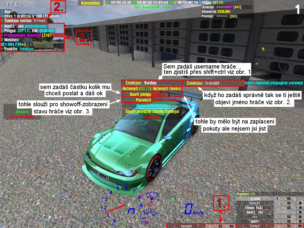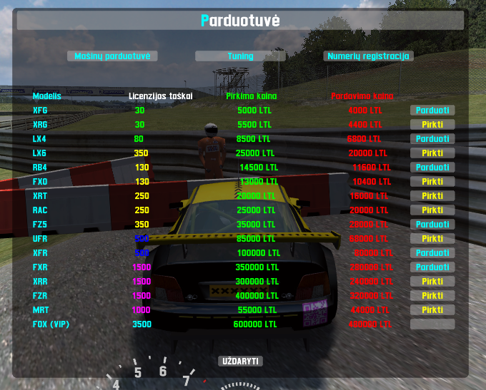 Po zastavení před postavou se zobrazí tabulka, která má nadpis Parduotuvé tedy obchod. Je zde možné zakoupit nebo prodat auta. Tabulka má tři tlačítka Mašiny parduotuvé Tuning a Numeriu registracija.